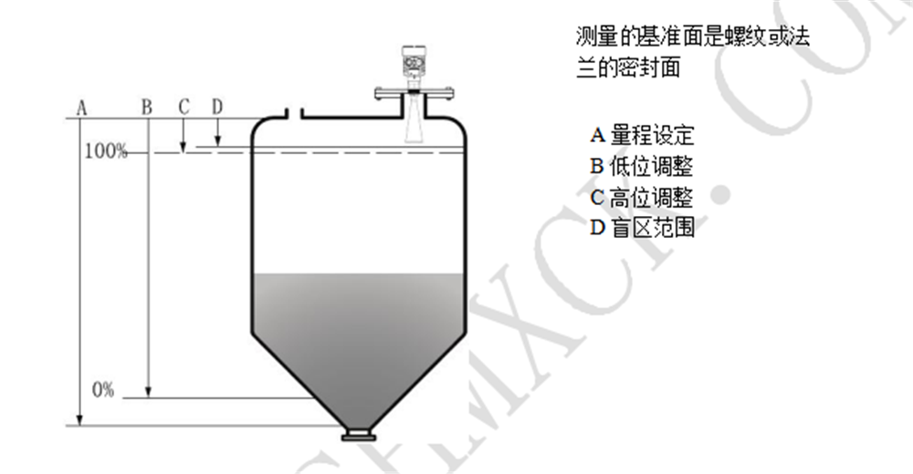 注:使用雷達(dá)物位計(jì)時(shí),務(wù)必保證最高料位不能進(jìn)入測量盲區(qū)(圖中D所示區(qū)域)