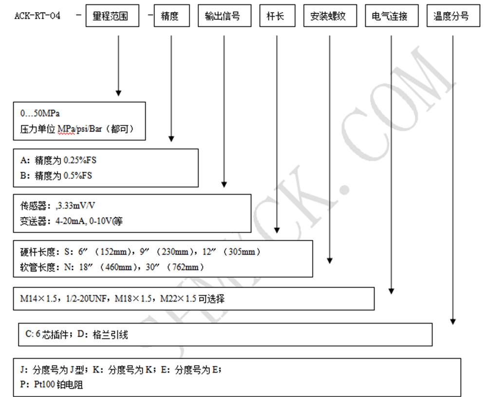 | ACK-RT-04T | 50MPA | 0.5%S | 4-20MA | 6=152MM/460MM | M14*1.5 | 6芯插件 | PT100 |