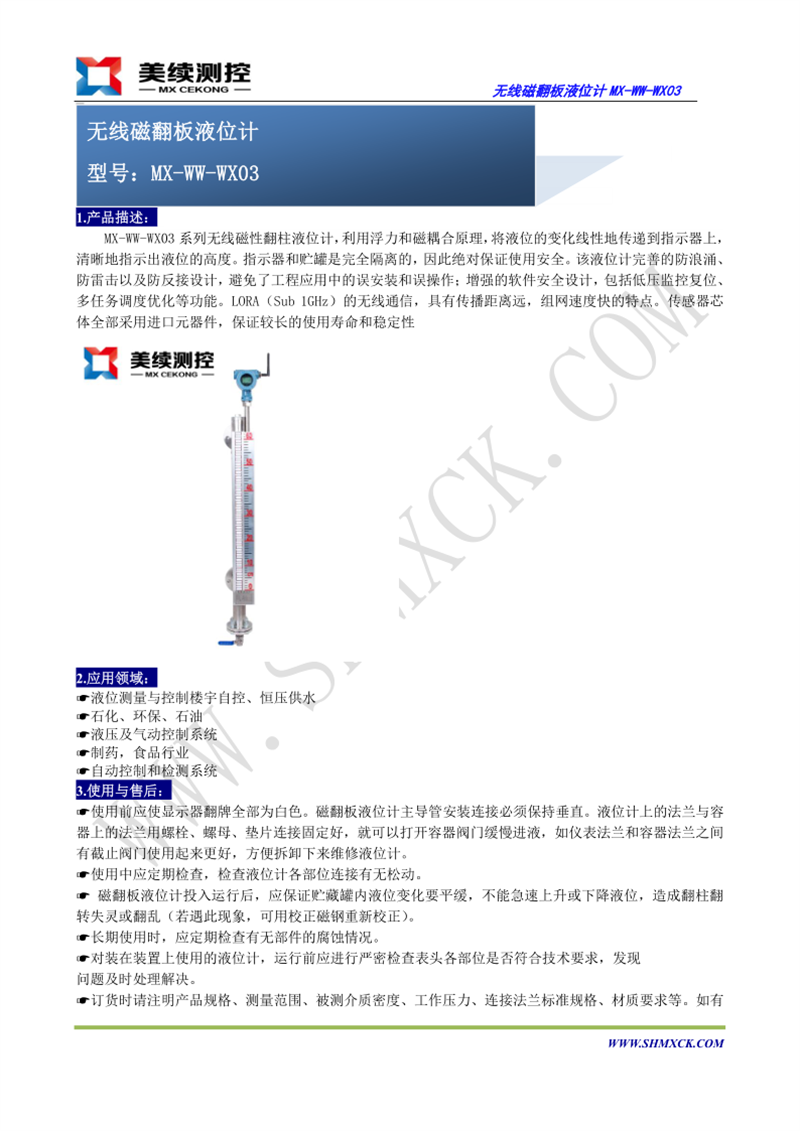 MX-WW-WX03系列無(wú)線磁性翻柱液位計(jì),利用浮力和磁耦合原理,將液位的變化線性地傳遞到顯示器上,清晰地指示出液位的高速度。