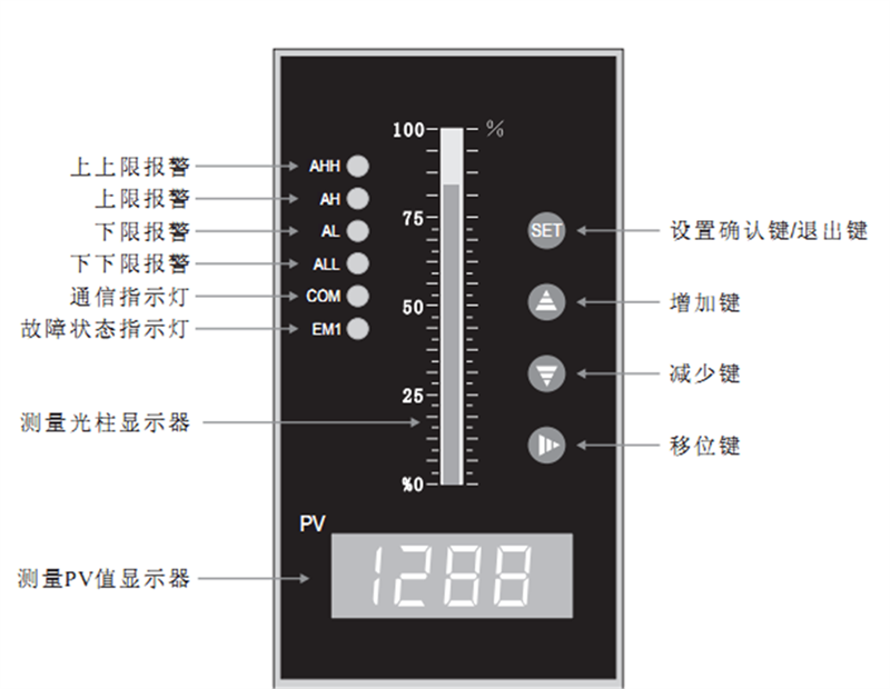 | 顯示方式: | 1999-9999測(cè)量值顯示;0-100測(cè)量值光柱顯示。 |
