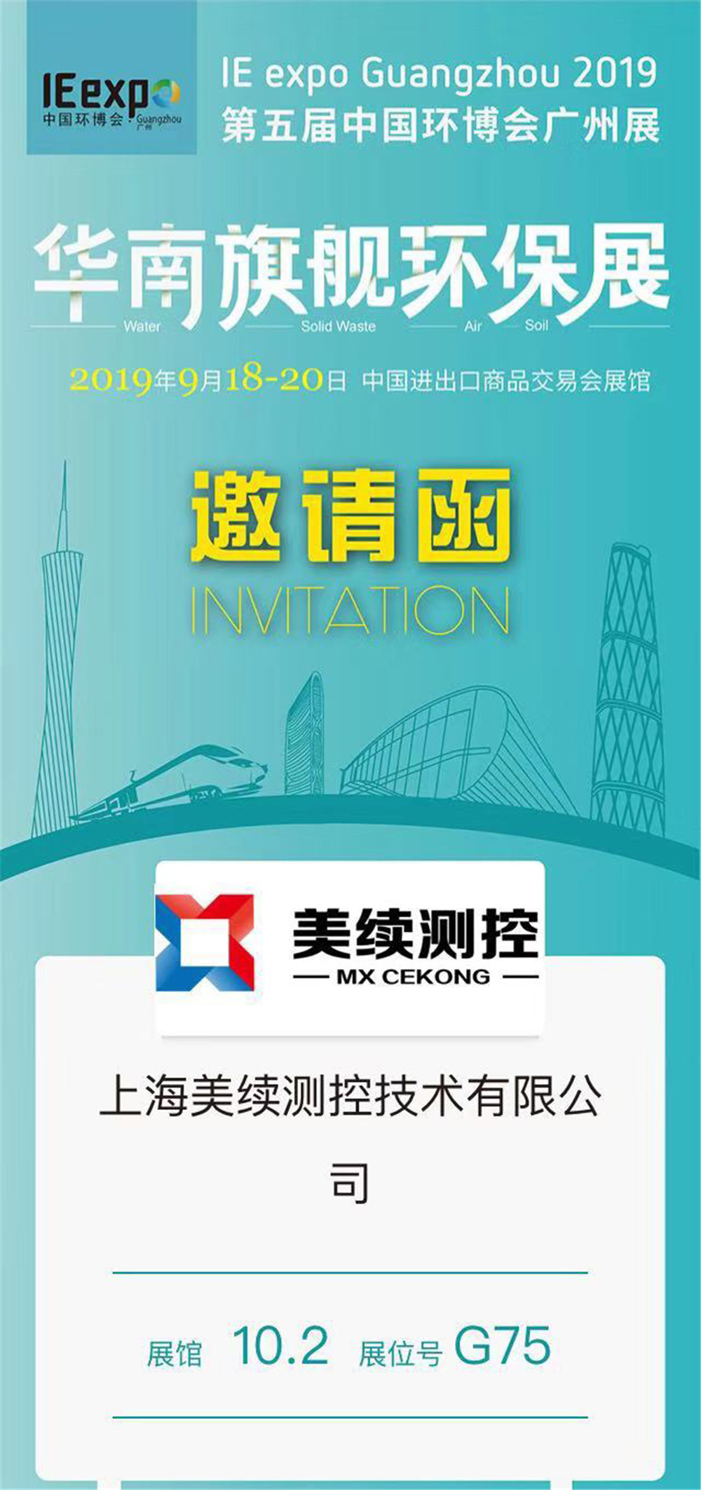 8月底剛剛分別的上海國(guó)際化工展,美續(xù)測(cè)控即將在IE expo Guangzhou 2019中國(guó)環(huán)博會(huì)廣州展展館10.2,展位號(hào)G75與你們?cè)俅蜗嘤觥?br />
